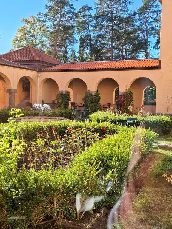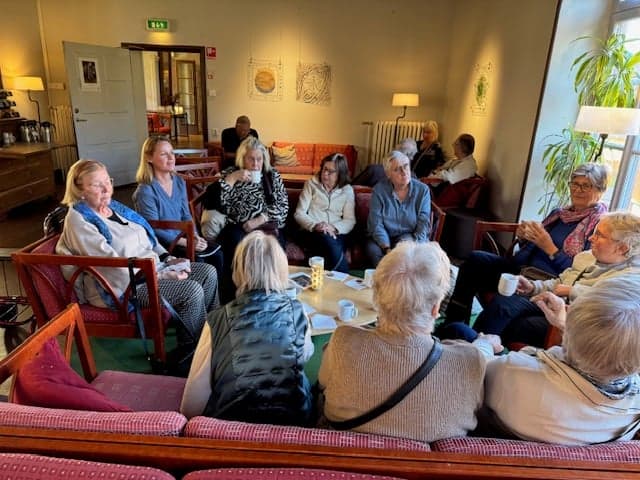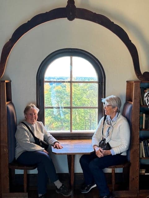 Efter stadsvandringen vankades det en god lunch uppe på Sigtunastiftelsen. Stiftelsen erbjuder en vacker miljö och har sedan tillkomsten varit en plats där människor träffas för samtal och vila. Sara berättade om stiftelsen och visade oss de ”vardagsrum” som fanns. Några av oss klättrade upp till tornrummen där flera av våra stora författare skrivit sina böcker.