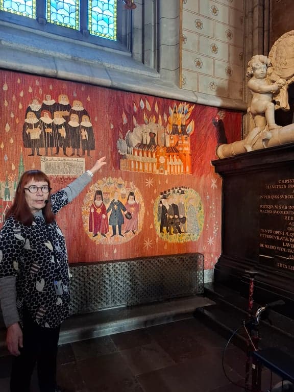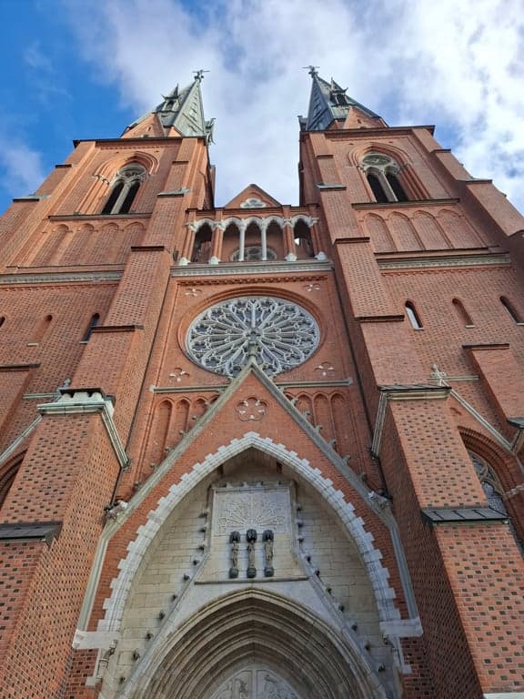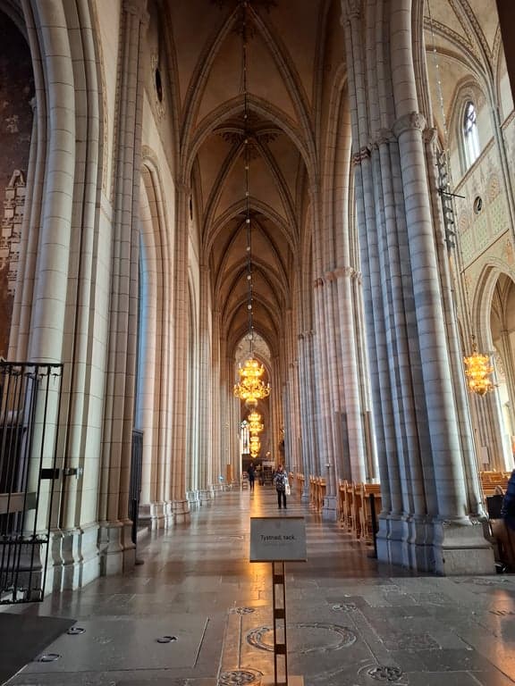 Resmålet blev Uppsala domkyrka eftersom där ligger flera av Vasarna begravda. Vi möttes av ett storslaget kyrkorum och en mycket kunnig guide. En del av det hon berättade om, kände vi igen från boken och vi fick också delar av det vi läst om mer påtagliga. Domkyrkan är mycket vacker med många härliga vävnader i varma färger. Där finns också gravar och gravmonument. Jag är inte helt säker på hur jag tänker och känner kring att Gustav Vasa ligger där mellan två av sina tre drottningar. Ja ja, de hade väl andra sätt att tänka på den tiden.